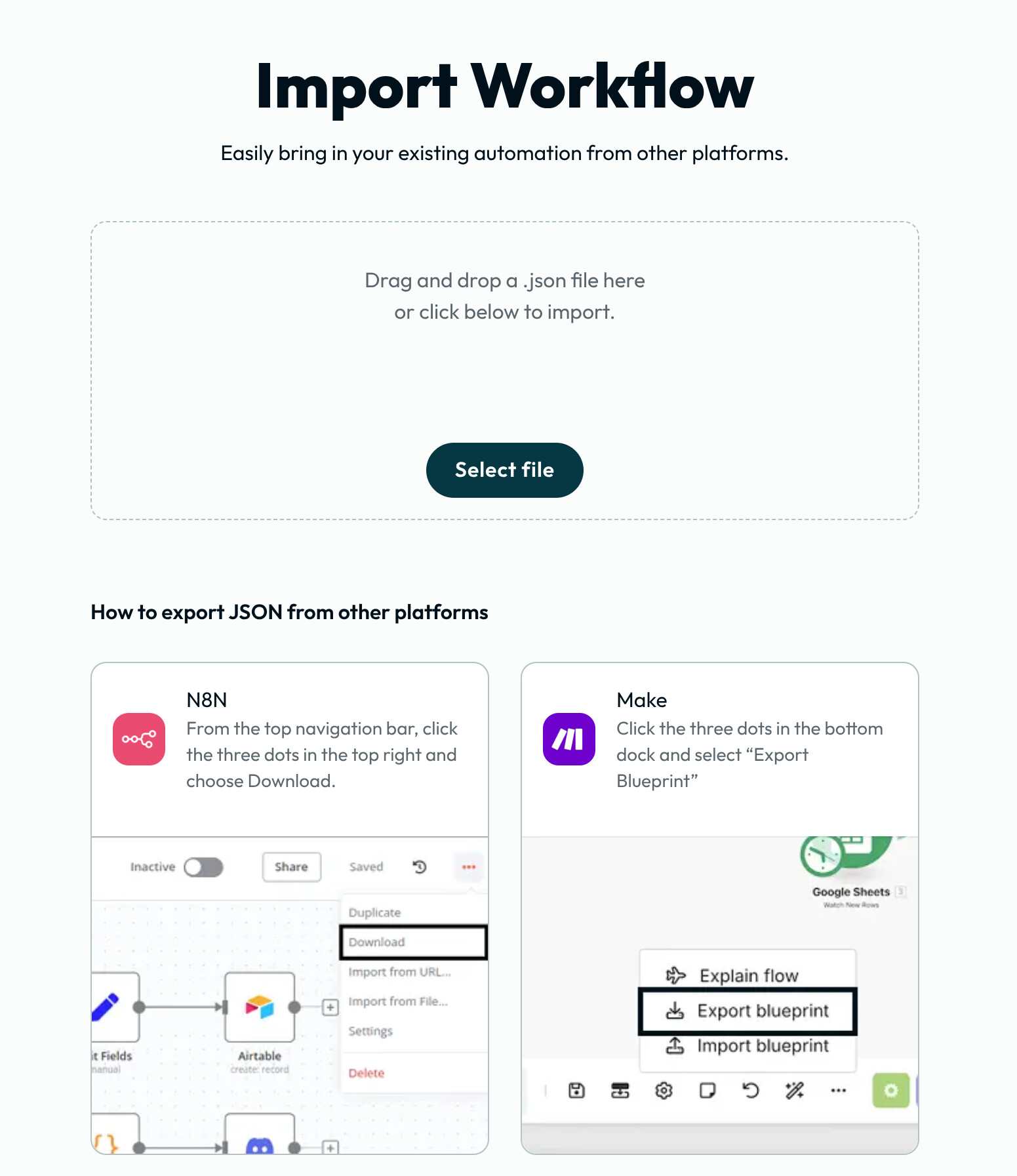 - Export your scenario from N8N or Make as a JSON file.